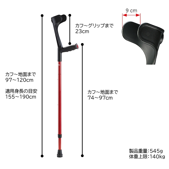 | サイズ | 地面からグリップまで:74~97cm グリップからアームカフまで:23cm |