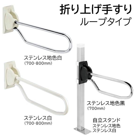 折り上げ手すりループタイプを壁に設置できない場合に。 折り上げ式手すりループタイプ専用の自立スタンドです。 手すりの高さは86cmまで無段階に調節・固定ができます。 ステンレス地色とステンレス白からお選びいただけます。 |