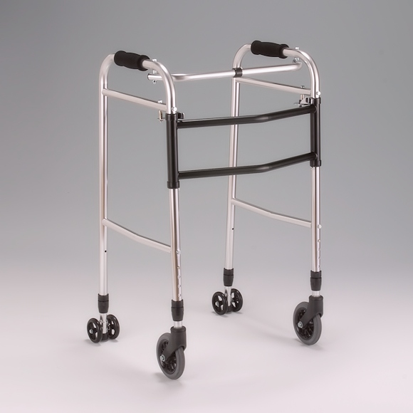 | キャスター転がしながら歩行する歩行器。そのままの歩行器形状での歩行、左右を別に動かして歩行する交互式のどちらでもできる兼用式。体重を掛けると後輪がロックするの、一歩づつゆっくり歩行ができます。 |