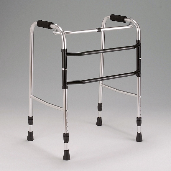 | 歩行器の脚を交互に進めながら歩行する交互歩行器。病院やリハビリ施設で使用されている定番品。アルミニウム製で軽量、折りたたみ機能付き。 |