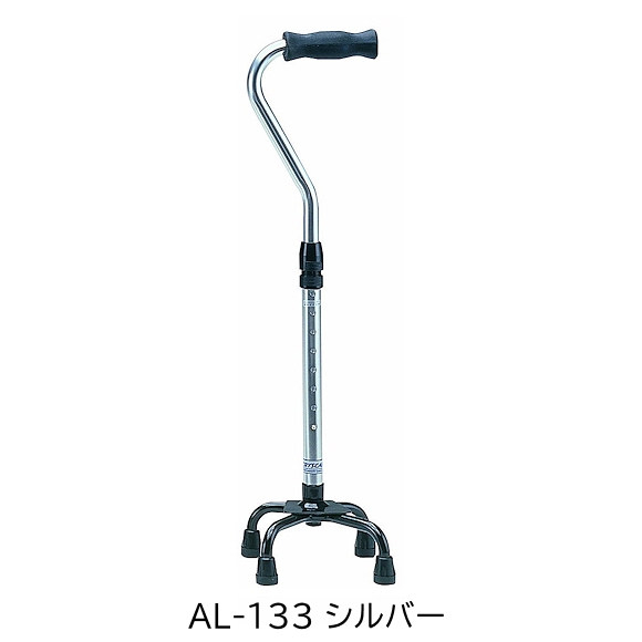高齢者や障害者が日常生活動作を支える歩行補助4点手杖。歩行が安定するラージベース。手のひらがグリップを包み込むようなグリップ形状です。