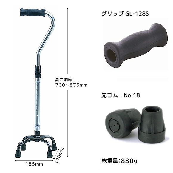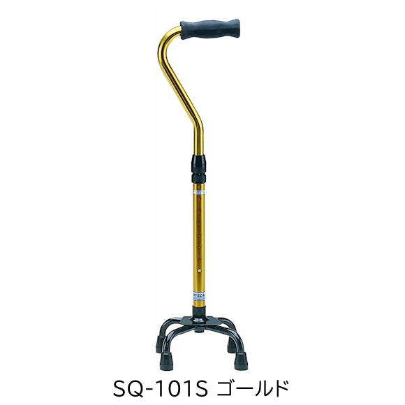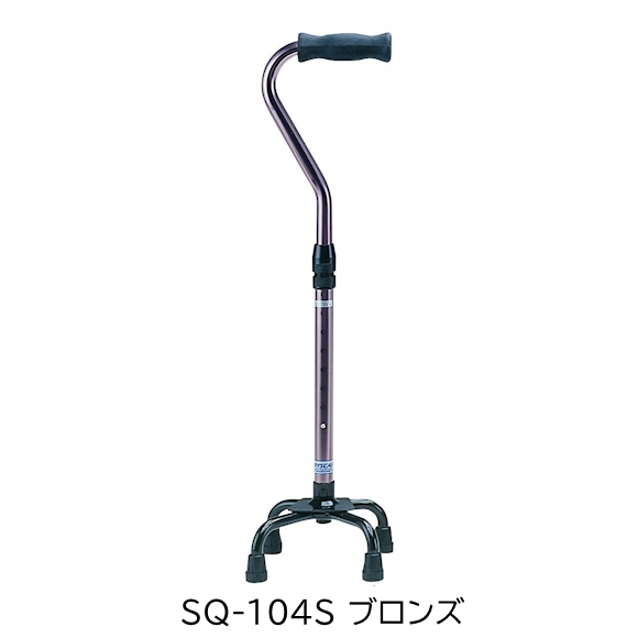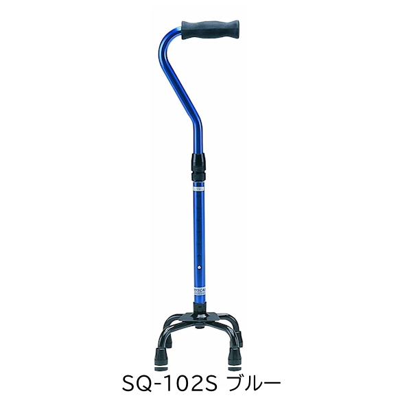 高齢者や障害者が日常生活動作を支える歩行補助4点手杖。歩行の妨げになりにくいスモールベース。手のひらがグリップを包み込むようなグリップ形状です。
