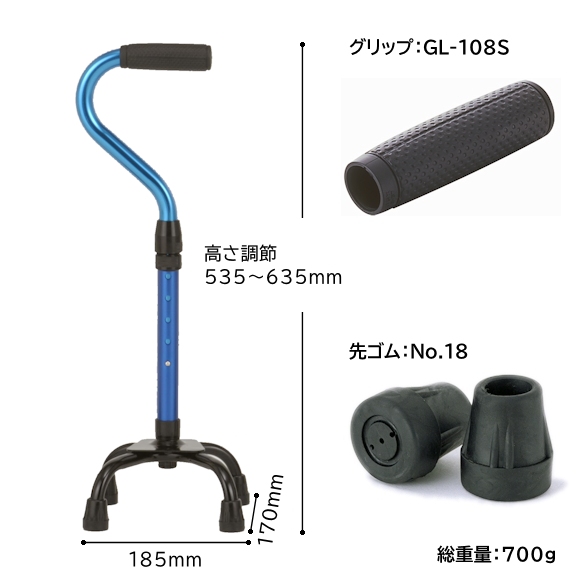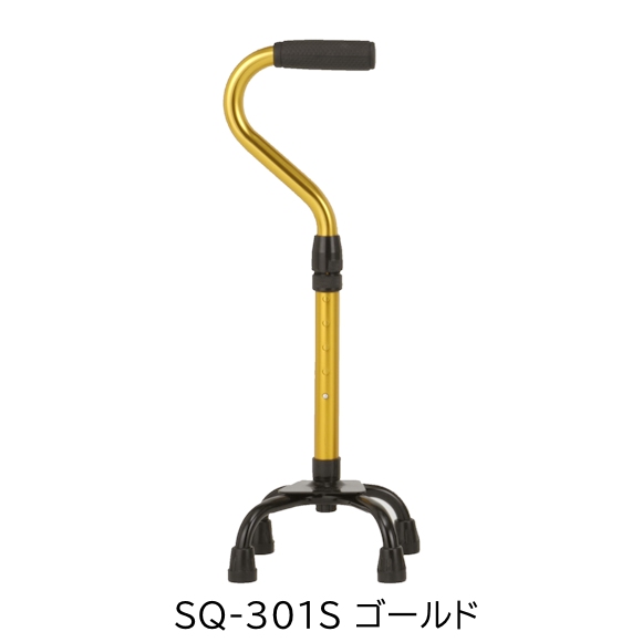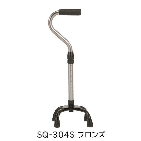 高齢者や障害者が日常生活動作を支える歩行補助4点手杖。歩行の妨げになりにくいスモールベース。手のひらがグリップを包み込むようなグリップ形状です。